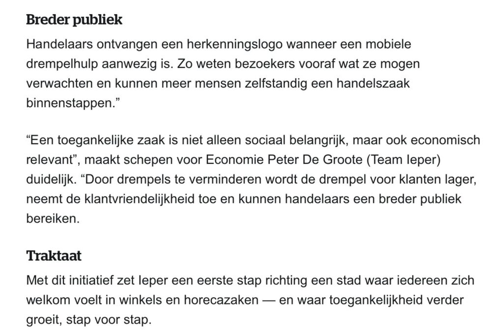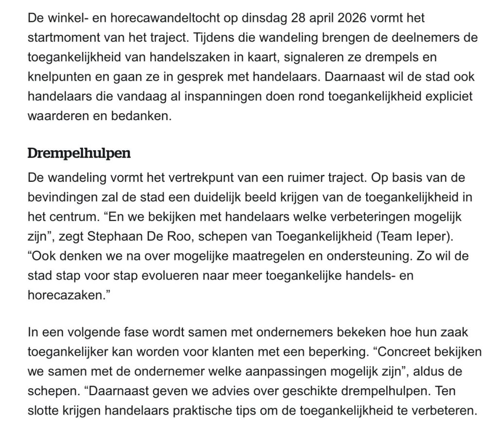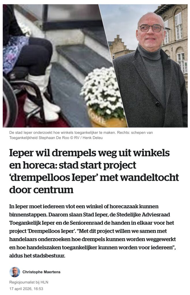 Home / verkeersveiligheid & mobiliteit / Drempelloos Ieperverkeersveiligheid & mobiliteitDrempelloos Ieper Geen reacties18/04/2026 Ieper wil drempels weg uit winkels en horeca. Share Post Share Previous ArticleOp bezoek bij Okra HollebekeNext ArticleEventjes piepen bij Vief IeperwebmasterSign Up For Daily NewsletterStay updated with our weekly newsletter. Subscribe now to never miss an update![mc4wp_form] Related Posts Meer ruimte voor fietsers in het centrum van Ieper 28/03/2026 De mobiliteit in de binnenstad 18/02/2026 Kleine hindernissen, grote impact 03/12/2025 Laat een reactie achter Reactie annulerenJe e-mailadres zal niet getoond worden. Vereiste velden zijn gemarkeerd met *ReactieNaam * E-mail * Website Mijn naam, e-mailadres en website opslaan in deze browser voor de volgende keer wanneer ik een reactie plaats. Δ