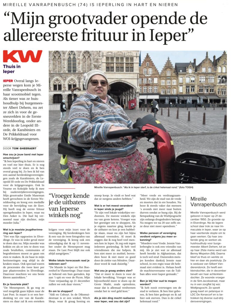 Home / Ieperse senioren in het nieuws / Mireille Vanrapenbusch is Ieperling in hart en nierenIeperse senioren in het nieuwsMireille Vanrapenbusch is Ieperling in hart en nieren Geen reacties13/10/2025 Mijn grootvader opende de allereerste frituur in Ieper Share Post Share Previous ArticleSfeerbeelden van ‘AI – Vloek of Zegen’Next ArticleEven kennismaken met LDC Ter PlekkewebmasterSign Up For Daily NewsletterStay updated with our weekly newsletter. Subscribe now to never miss an update![mc4wp_form] Related Posts Georgette kreeg het bezoek van Viktor Verhulst 24/04/2026 Seniorenraad Ieper bouwt aan zichtbaarheid 21/04/2026 Marleen Neyrinck (61) is thuis in Ieper 12/04/2026 Laat een reactie achter Reactie annulerenJe e-mailadres zal niet getoond worden. Vereiste velden zijn gemarkeerd met *ReactieNaam * E-mail * Website Mijn naam, e-mailadres en website opslaan in deze browser voor de volgende keer wanneer ik een reactie plaats. Δ