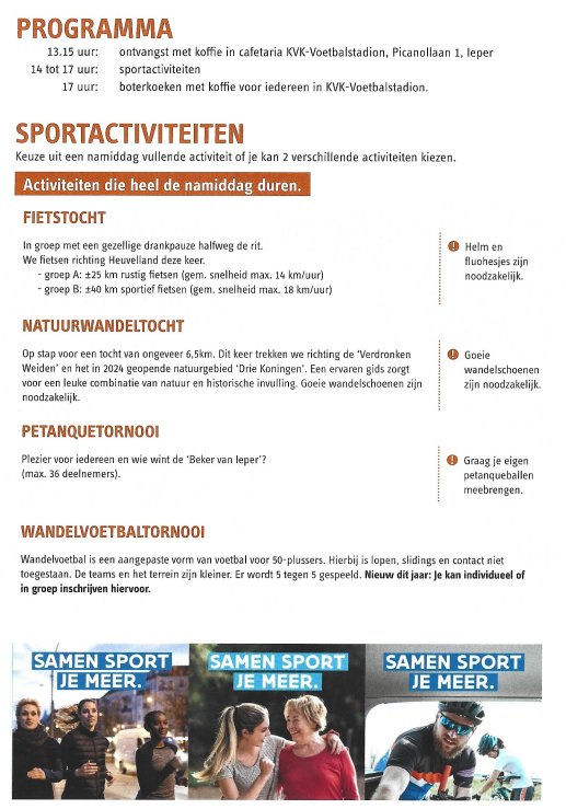 Home / activiteiten / Sportdag voor 50-plussersactiviteitenSportdag voor 50-plussers Geen reacties09/01/2025 Share Post Share Previous ArticleHonderden activiteiten van de Ieperse seniorenNext ArticleJef Verschoore – voorzitter seniorenraad IeperwebmasterSign Up For Daily NewsletterStay updated with our weekly newsletter. Subscribe now to never miss an update![mc4wp_form] Related Posts Op bezoek bij Okra Hollebeke 17/04/2026 23ste Sportdag voor 50-plussers 10/04/2026 Robots. Nu en in de toekomst. 04/04/2026 Laat een reactie achter Reactie annulerenJe e-mailadres zal niet getoond worden. Vereiste velden zijn gemarkeerd met *ReactieNaam * E-mail * Website Mijn naam, e-mailadres en website opslaan in deze browser voor de volgende keer wanneer ik een reactie plaats. Δ